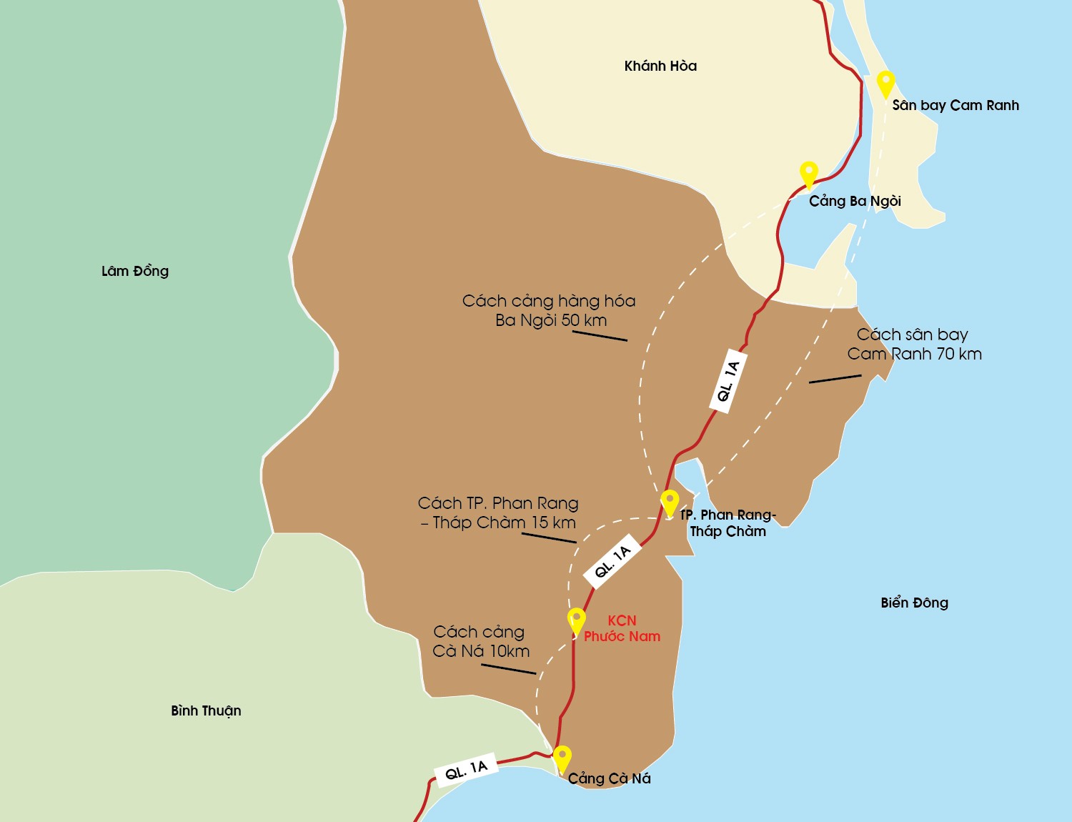 Khu công nghiệp Phước Nam sở hữu vị trí địa lý vô cùng thuận lợi khi nằm trên trục đường Quốc lộ 1, đường sắt Bắc Nam, cách Tp. Phan Rang – Tháp Chàm 15 km về phía Bắc, cách Khu du lịch Cà Ná 10 km về phía Nam, cách ga Tháp Chàm 15 km, sân bay Cam Ranh 70 km và cảng hàng hóa Ba Ngòi 50 km, cách TP. Nha Trang 120 km, cách TP. Hồ Chí Minh 335 km đường bộ.